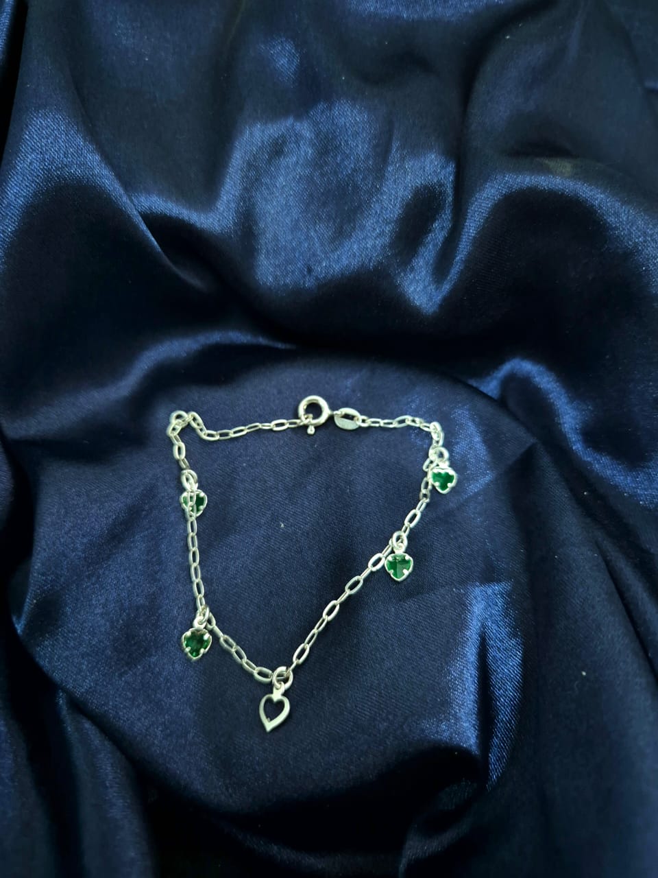 Abrace a sofisticação com esta pulseira em prata 925, adornada com pingentes em formato de coração e detalhes verdes encantadores. Um acessório perfeito para quem valoriza elegância e um toque de cor sutil.